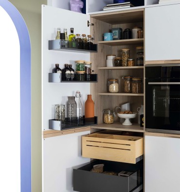 Avec cet aménagement, l’accès aux produits du quotidien se fait d’un geste en ouvrant simplement la porte du placard de cuisine. À sa fermeture, ce rangement disparait pour laisser place à une cuisine épurée et un espace rangé. Optimisé à tous niveaux, ce système utilise toute la largeur et la hauteur disponibles de la façade de l’armoire ou du meuble bas qui l’accueille. La couleur anthracite de l’acier des bacs s’accorde harmonieusement avec toutes les finitions de porte, du blanc au noir et de la couleur aux décors bois.