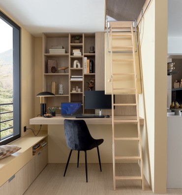 Sous un escalier menant à une mezzanine, un bureau d'entrée peut se glisser parfaitement sous les marches, optimisant ainsi un lieu souvent inexploité. Ce type d'aménagement permet de créer un bureau discret et pratique, sans empiéter sur la surface habitable. Un bureau mural ou un plan de travail escamotable peut y être installé pour un maximum de flexibilité, tout en intégrant des rangements intelligents pour optimiser le moindre recoin.